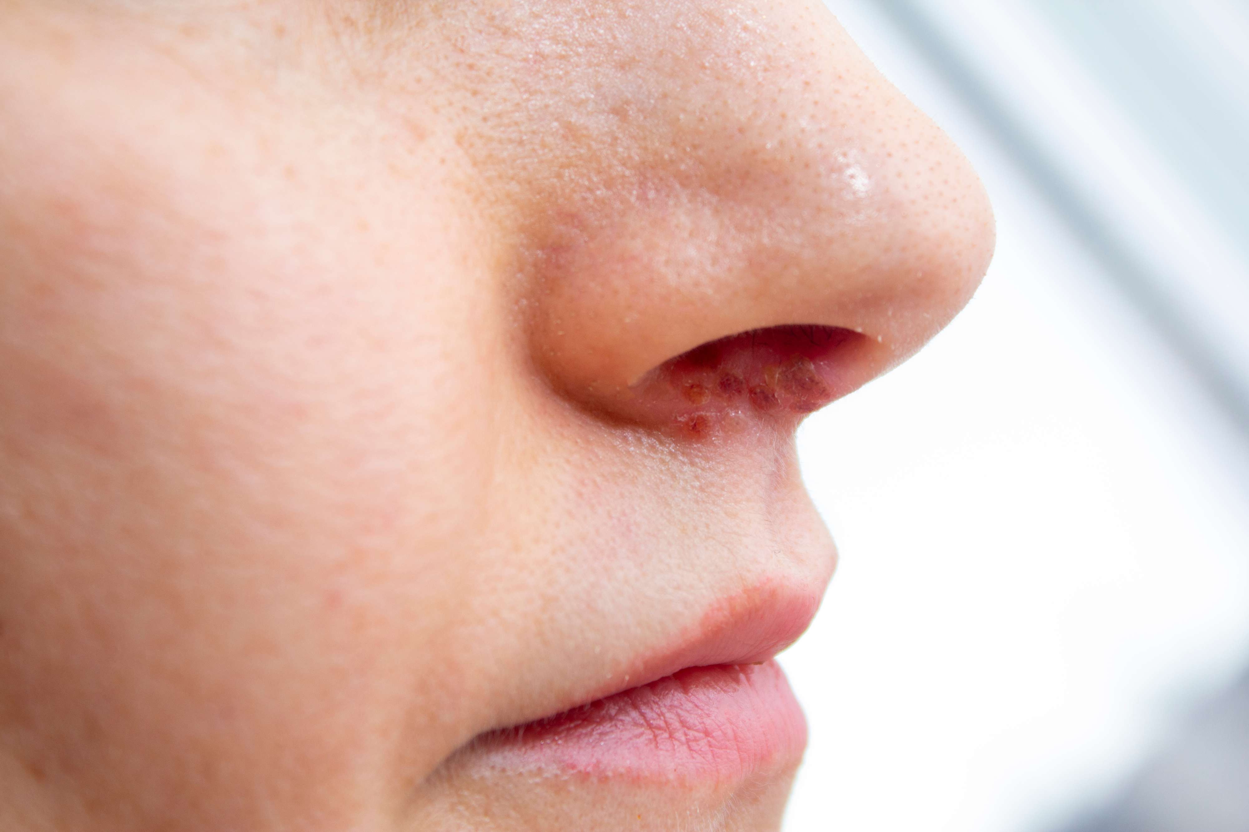 Herpesbläschen an oder in der Nase können schmerzhaft sein.